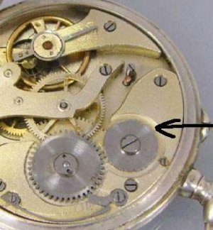 Bei genauerer Inspektion sieht man, dass am Kronrad sämtliche Zähne fehlen (Pfeil) und