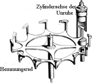 ist. Die dreieckigen, und auf kurze Stege gesetzten Hemmungsradzähne greifen in den schlitzartig aufgeschnittenen Hohlzylinder ein und